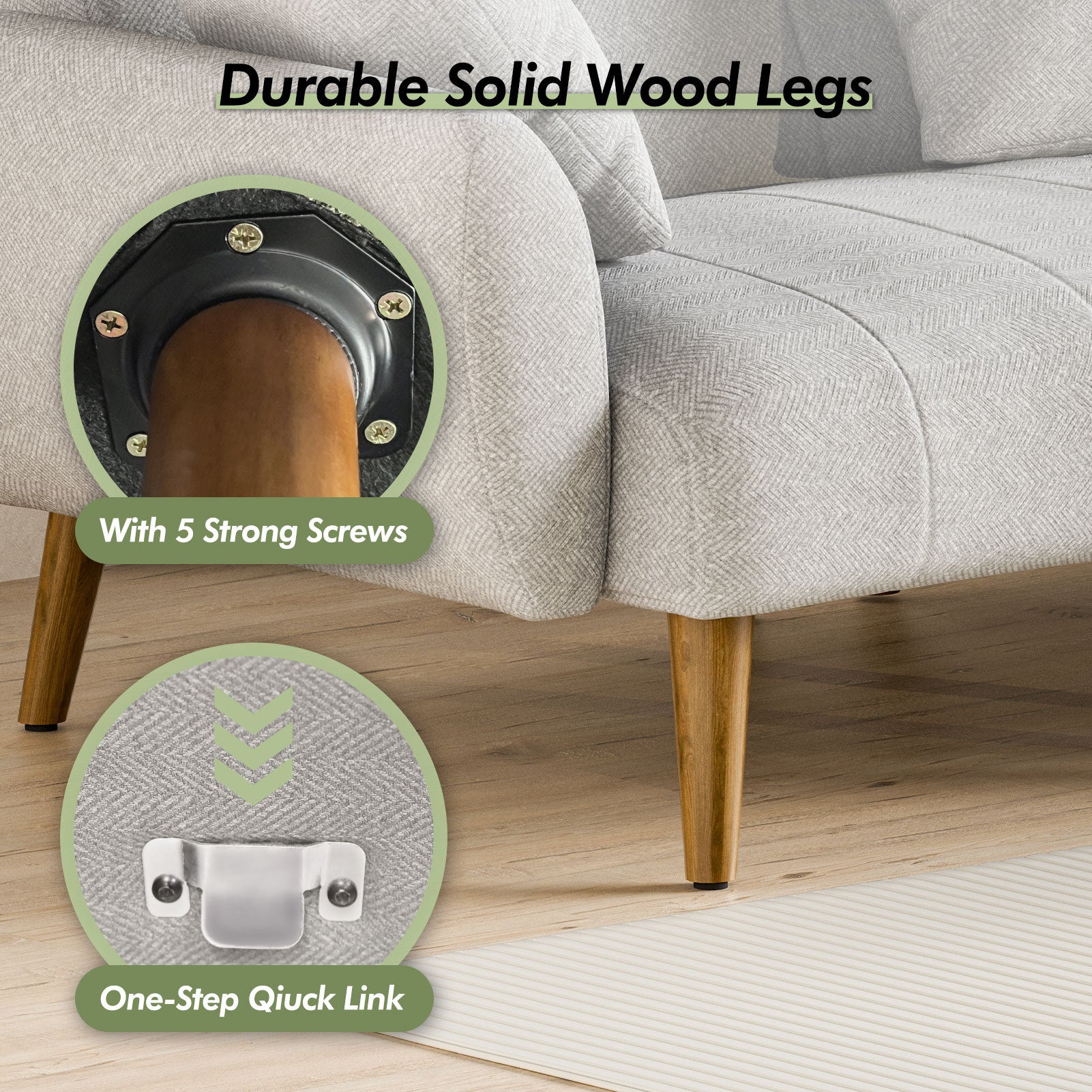 - Material : High - density and resilience sponge, breathable fabric, and solid wooden legs.