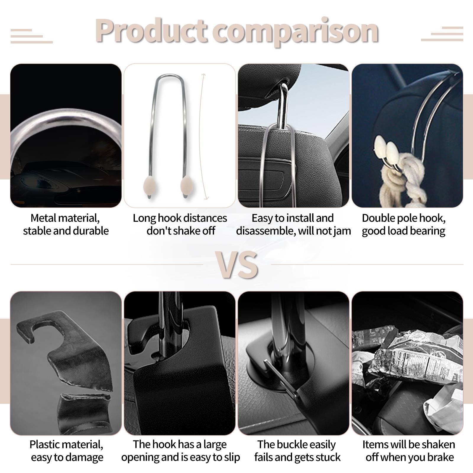 Optimize space utilization: In the narrow interior environment of the car, hidden type does not occupy space, and hooks can maximize the utilization of vertical space.