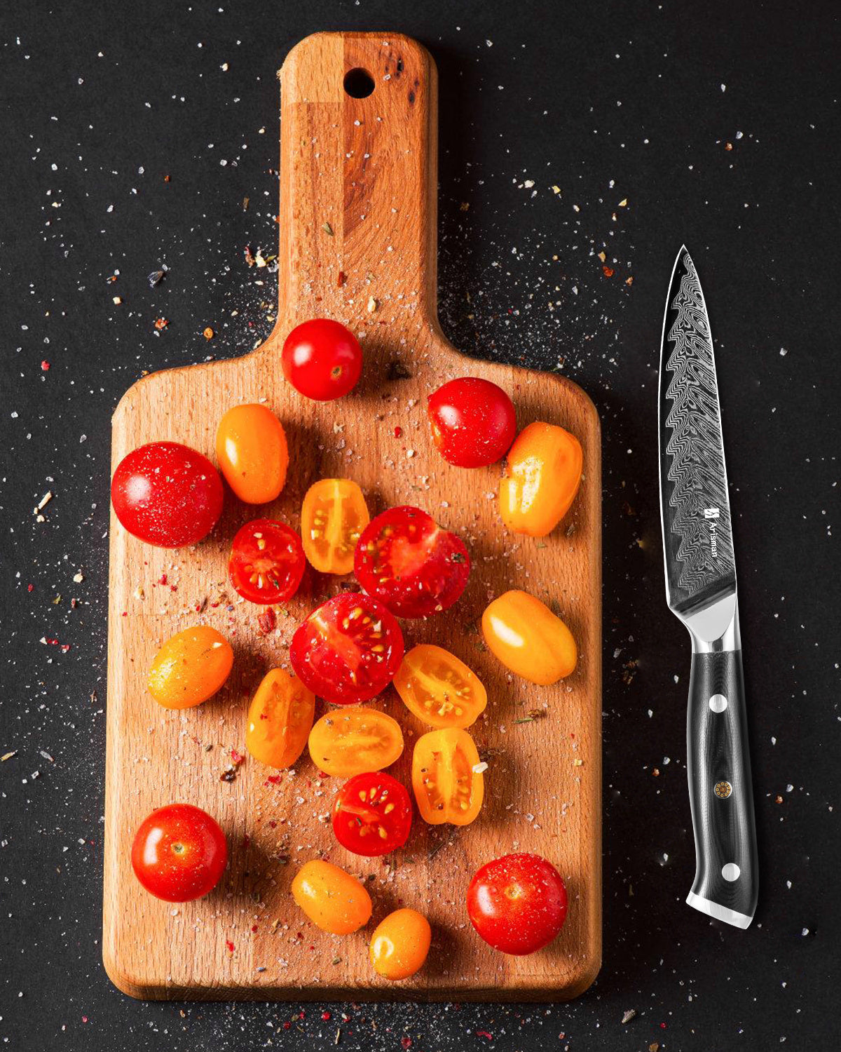 - PREMIUM SHARP - An extremely sharp small kitchen knife. The edges on both sides are hand-ground and polished at 12-15¡ã. It cuts without resistance and can keep food in the best condition when cutting. The convenient 5 inch blade and 4-inch handle design handle any fruit or vegetable easily and smoothly, lightweight and efficient, which is perfect for professional chefs and everyday kitchens