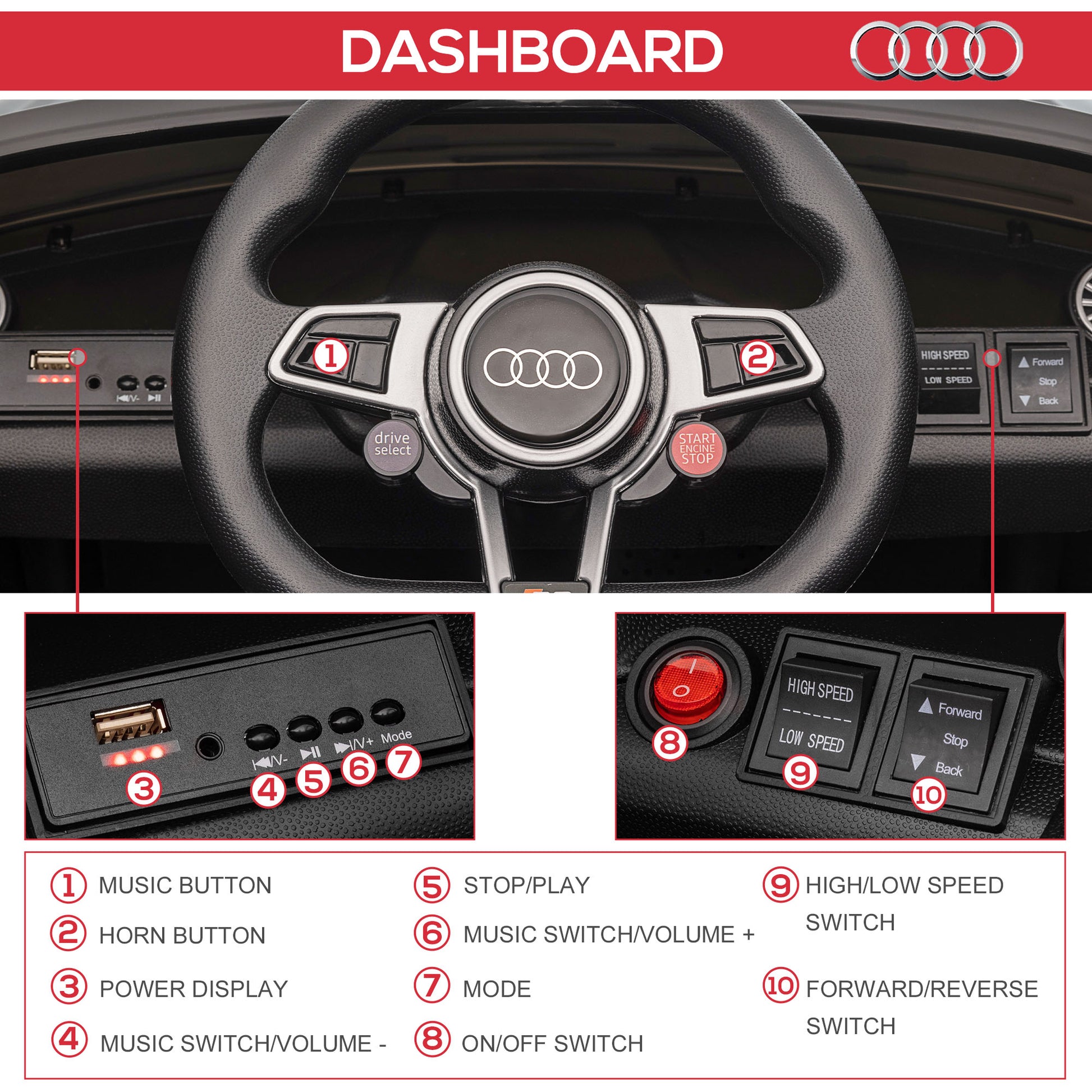 Offer your kids this Audi licensed kids luxury car from Aosom to satisfy their dream of being a road adventurer! Featuring all sorts of functions including front and backlights, built-in music player with USB and MP3 port, as well as a safety belt to make it look and feel like a real car and to give your kids an authentic driving experience. We provide both manual and remote control. With 40 minutes of continuous fun per charge, your little drivers will be revving it up into the sunset. Features: - 6V motor for a powerful drive and 40 minutes of continuous play off a single charge - Includes both manual and remote control so kids or parents can direct the kids' electric vehicles - Features a USB and MP3 port so that children can play MP3s while driving - Separate horn and music buttons on the steering wheel for loud and clear audio - Comes with functioning front and rear headlights for fun and lighting the way - Comfortable interior with working seat belt and four-wheel suspension system for added safety while sitting - Power indicator to monitor how much power is remaining in the battery Specification: - Color: Black - Material: PP, Steel - Overall dimension: 40.25" L x 23.5" W x 17.25" H - Seat dimension: 14" L x 7.75" W x 8.5" H - Wheel size: §¶8.25" x 2.5" W - Max Speed: 1.9mph - Charging time: 8-12h - Motor: 30W - Charger: 6V/500MA - Certificated Age: 37 ¨C 95 months - Recommended Age: 37 ¨C 60 months - Weight capacity: 55 lbs - Net weight: 26lbs - ASTM F963,CPSIA certified product - Item Label: 370-079BK Package Includes: - 1 x Electric ride-on car - 1 x Manual Offer your kids this Audi licensed ride-on car from Aosom to satisfy their dream of being a road adventurer! Featuring all sorts of functions including front and back lights, built-in music player with USB and TF card slots, as well as a safety belt to make it look and feel like a real car and to give your kids an authentic driving experience. This electric vehicle welcomes kids from 3 to 6 years old and can hold a maximum of 65 pounds. For added safety, parents can control the car with the included remote control. We provide both manual and remote control so that children or their parents can control the vehicle. With one hour of continuous fun per charge, your little drivers will be revving it up into the sunset. Features: - 6V motor for a powerful drive and 1 hour of continuous play off a single charge - Includes both manual and remote control so kids or parents can direct the vehicle - Features a USB and TF card slot so that children can play MP3s while driving - Separate horn and music buttons on the steering wheel for loud and clear audio - Comes with functioning front and rear headlights for fun and lighting the way - Comfortable interior with working seat belt and four-wheel suspension system for added safety while sitting - Power indicator to monitor how much power is remaining in the battery Specification: - Overall dimension: 40.5"L x 24.75"W x 17.25"H - Seat dimension: 13"L x 7"W x 9"H - Wheel size: §¶8" x 2.75" - Max Spped: 1.9mph - Charging time: 8-12h - Material: PP, Steel - Color: White - Motor: 35w - Charger: 6V/500MA - Suitable for kids between 3 and 6 years old - Weight capacity: 66 lbs. - Net weight: 27lbs. - ASTM F963,CPSIA certified product Offer your kids this Audi licensed kids luxury car from Aosom to satisfy their dream of being a road adventurer! Features: - 6V motor for a powerful drive and 40 minutes of continuous play off a single charge - Includes both manual and remote control so kids or parents can direct the kids' electric vehicles - Features a USB and MP3 port so that children can play MP3s while driving - Separate horn and music buttons on the steering wheel for loud and clear audio - Comes with functioning front and rear headlights for fun and lighting the way - Comfortable interior with working seat belt and four-wheel suspension system for added safety while sitting - Power indicator to monitor how much power is remaining in the battery Specification: - Color: Red - Material: PP, Steel - Overall dimension: 40.25" L x 23.5" W x 17.25" H - Seat dimension: 14" L x 7.75" W x 8.5" H - Wheel size: §¶8.25" x 2.5" W - Max Speed: 1.9mph - Charging time: 8-12h - Motor: 30W - Charger: 6V/500MA - Certificated Age: 37 ¨C 95 months - Recommended Age: 37 ¨C 60 months - Weight capacity: 55 lbs - Net weight: 26lbs - ASTM F963,CPSIA certified product - Item Label: 370-079RD Package Includes: - 1 x Electric ride-on car - 1 x Manual Offer your kids this Audi licensed kids luxury car from Aosom to satisfy their dream of being a road adventurer! Features: - 6V motor for a powerful drive and 40 minutes of continuous play off a single charge - Includes both manual and remote control so kids or parents can direct the kids' electric vehicles - Features a USB and MP3 port so that children can play MP3s while driving - Separate horn and music buttons on the steering wheel for loud and clear audio - Comes with functioning front and rear headlights for fun and lighting the way - Comfortable interior with working seat belt and four-wheel suspension system for added safety while sitting - Power indicator to monitor how much power is remaining in the battery Specification: - Color: Yellow - Material: PP, Steel - Overall dimension: 40.25" L x 23.5" W x 17.25" H - Seat dimension: 14" L x 7.75" W x 8.5" H - Wheel size: §¶8.25" x 2.5" W - Max Speed: 1.9mph - Charging time: 8-12h - Motor: 30W - Charger: 6V/500MA - Certificated Age: 37 ¨C 95 months - Recommended Age: 37 ¨C 60 months - Weight capacity: 55 lbs - Net weight: 26lbs - ASTM F963,CPSIA certified product - Item Label: 370-079V80YL Package Includes: - 1 x Electric ride-on car - 1 x Manual.