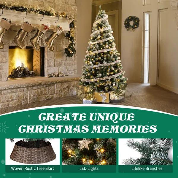US Local 7.5 FT Artificial Snow Tipped Christmas Tree With DIY 350 Warm Lights Remote Control, Hinged Xmas Pine Tree With Silver Ribbon Ornaments For Holiday Party Office Home, Green & Snow Tipped