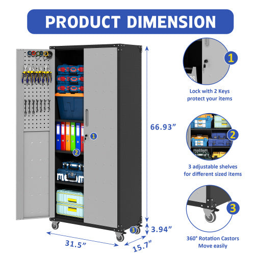 Product Name:71" Metal Garage Storage Cabinet with Wheels - Heavy-Duty Tool Storage Cabinet for Home, Office, School, and Garage Organization, Black/Gray