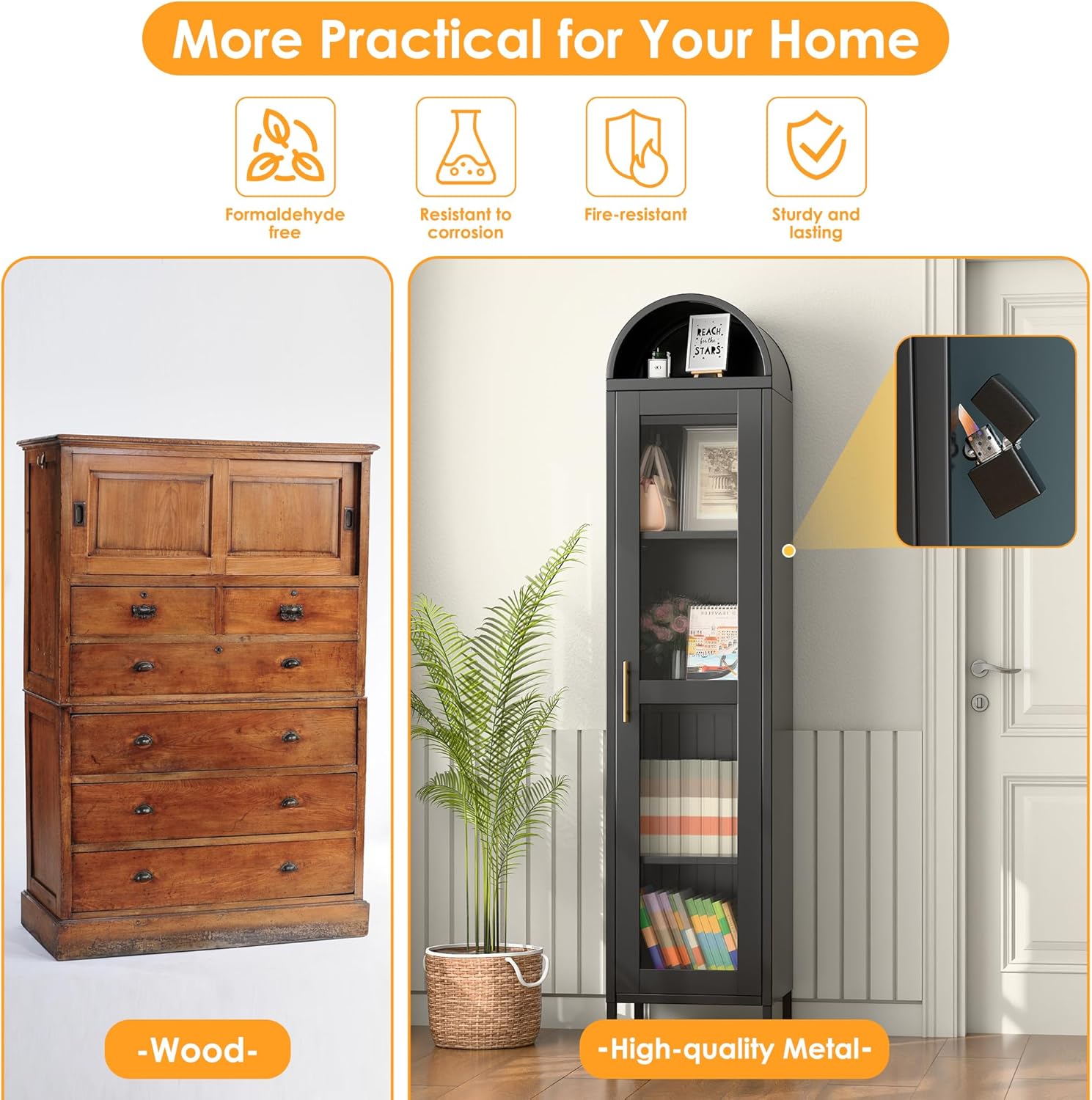 US Local 73 In Tall Metal Arched Cabinet, Kitchen Pantry Cabinet With Glass Door, Modern Farmhouse Arched Bookcase With 3 Adjustable Shelves For Dining Room And Living Room, Black, Assembly Required