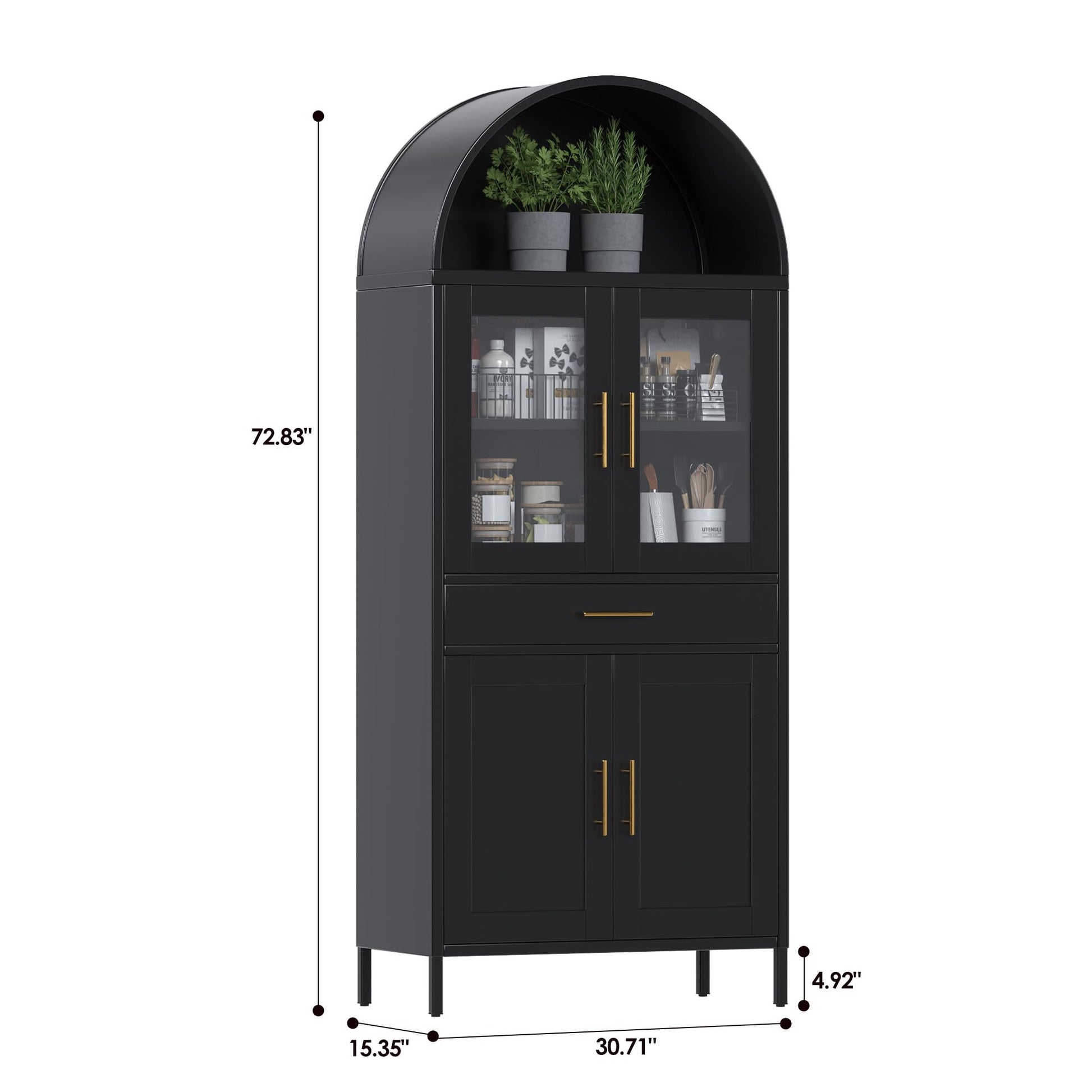 US Local 73 Inch Metal Tall Arched Display Cabinet, Metal Arched Bookshelf With Doors,Shelves,Drawers, Modern Freestanding Bookcase For Home Office Bar Living Room ,Black