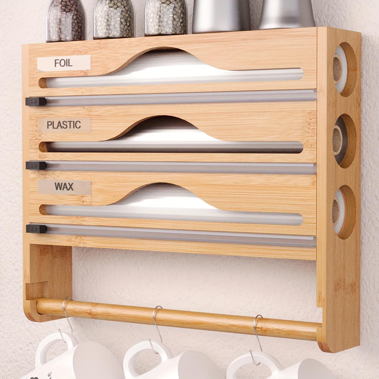 US Local Bamboo Plastic Wrap Cutter With Paper Towel Holder Kitchen Wall-mounted Tinfoil Cutter With Three-grid Cutter And Paper Towel Storage Rack