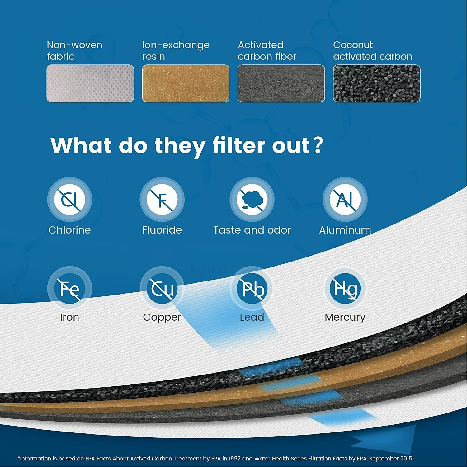 The BPA free Simpure filter combines with Ion Exchange Resin, Tourmaline, Mineral Balls, PP ,and Carbon with O-ring seal to prevent channeling water and ensure that all drops are filtered through layers ,to remove chlorine (taste and odor), odors, scales, arsenic, Zinc, Copper, mercury found in tap water for cleaner great tasting water