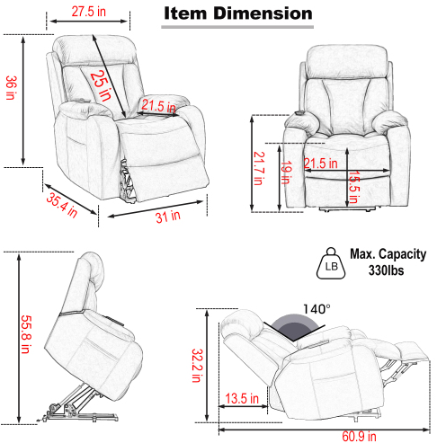 - Sturdy Construction: This recliner chair's heavy duty steel and wood frame safely supports up to 330 pounds even when fully reclined or raised.