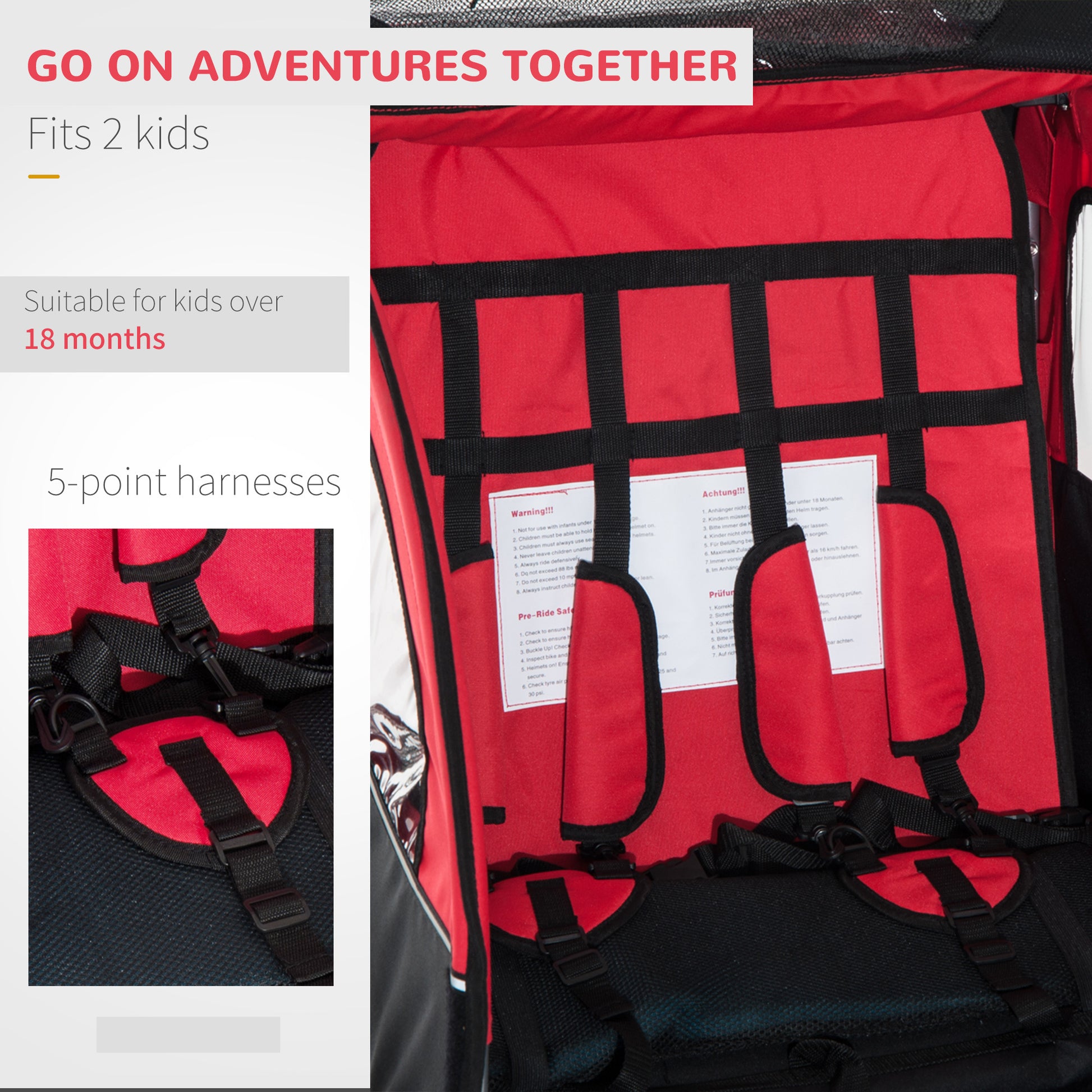 Parents often love to share what they are into with their children. For cycling enthusiasts, as luck would have it, kids and the outdoors go naturally together. The Aosom Elite bicycle trailer for kids is excellent for that golden time when they're getting inquisitive about the world but not quite old enough to ride alone. Whether around the block or over rough terrain, Aosom's child bike trailer has got you covered on your way. Features: - Features a locking swivel front wheel and complete suspension system for comfort and control - Robust all-steel frame with smooth-rolling 20" wheels for traversing uneven terrain - Suitable for two kids, each less than 40 lbs of weight, less than 43.25" of height - Sling-style pocketed seat with a five-point security harness for added protection - Includes an Aosom "Type A" bike hitch/coupler for easily connecting the trailer to a bicycle - Removable canopy helps shield from wind - Foldable to fit trunks and storage areas (Need to disassemble wheels, wheel guards, push handles, etc.) Specification: - Color: Red and Black - Material: Oxford Fabric, Steel Frame - Overall Dimension: 61" L x 34.75" W x 42.5" H (with connector), 49.6" L x 34.75" W x 42.5" H (without connector) - Cargo Size: 23.5" L x 30.25" W x 22" H - Foldable Size: 29.25" L x 25.5" W x 4.5" H - Front Wheel Size: 10" Dia. x 1.75" W - Rear Wheel Size: 20" Dia. x 1.75" W - Applicable Bicycle Wheel Size: ¦µ24"-¦µ29" - Weight Capacity: 88 lbs. - Approved Age: 18+ months - Recommended Height: Less than 43.25" - Item Label: 5664-0101RB Package Includes: - 1 x Child Trailer - 1 x Manual.