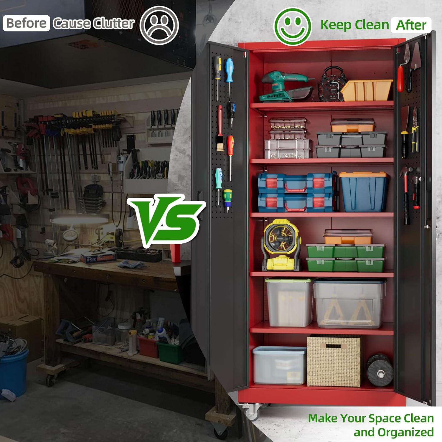 US Local Garage Storage Cabinet With Pegboard And 5 Adjustable Shelves, Metal Lockable Cabinet With Magnetic Doors,Tool Storage,Home Office Garage,Gym,School Black-red