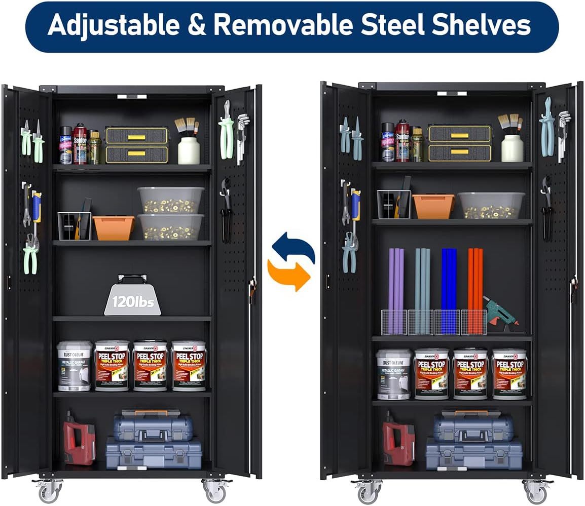 - ??Utility Pegboard & Adjustable Shelves ??Redesign your organizing ways, hang up everything on the door, get effortless accessible for a variety of small hardware, no more searching for things among the clutter. Tall Garage storage cabinet with wheels is designed with 4 adjustable shelves, you can easily meet your different storage needs by adjusting the height between the shelves.