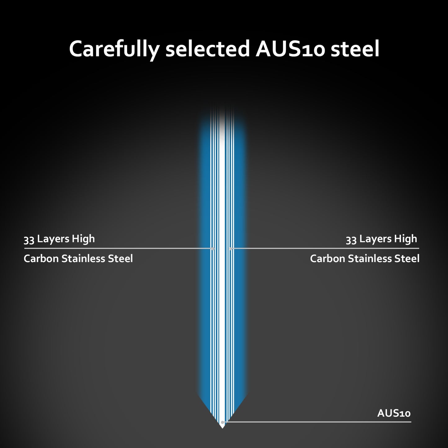 - PEAK PERFORMANCE - This 7-inch santoku knife is constructed with 67 layers of Damascus steel and a durable AUS-10 steel core. It has undergone precise quenching techniques and vacuum-cooled nitrogen treatment, which profoundly increases its resistance against corrosion, rust, and its overall toughness. This superior chef's knife boasts a Rockwell hardness of 60 ¡À 2HRC, ensuring it maintains its sharp cutting edge even after extended use.