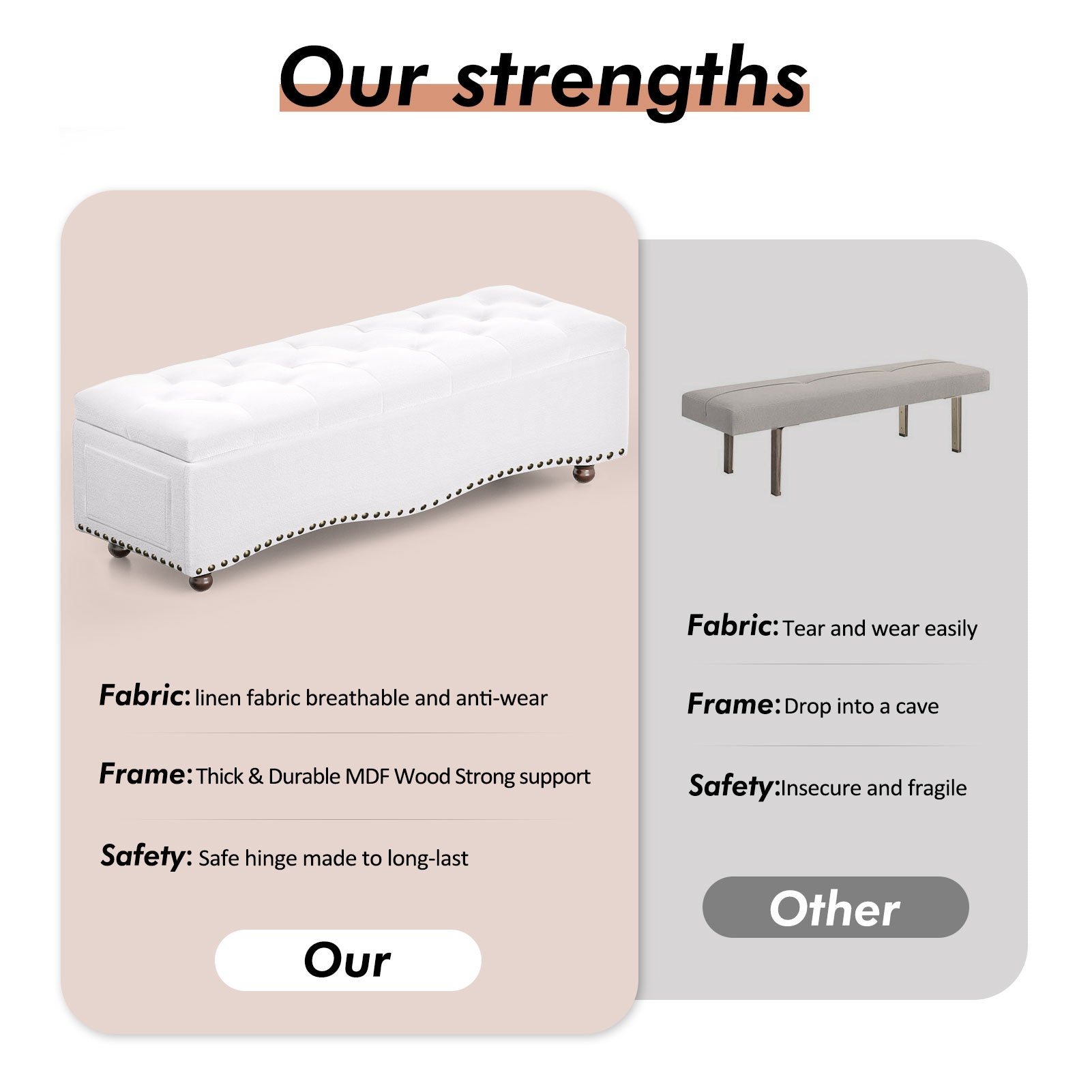 - Process : Upholstered with nailhead trim, roll arm design, safe hinge installation, and functional storage space crafting.