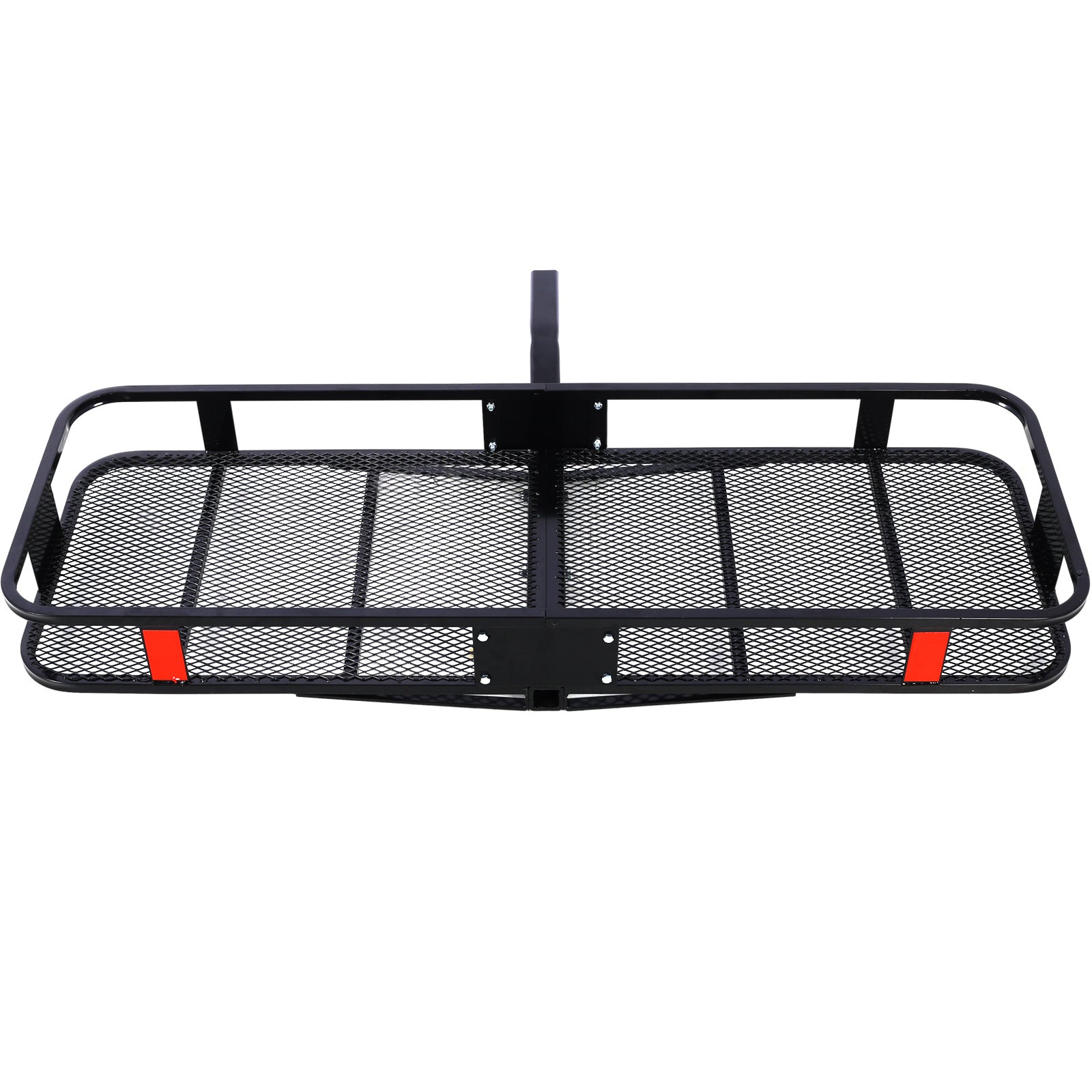 The Cargo Basket measures 60" long x 21" wide x 6" tall and has a maximum weight capacity of 500 lbs. It can be easily folded up when not in use, saving space during storage. This basket is compatible with cars, SUVs, vans, trucks, and Jeep Wranglers that have a 2" receiver hitch. It features a 2" shank rise for improved ground clearance. The basket is constructed with heavy-duty steel and has an Anti-Rust Coating to prevent corrosion.