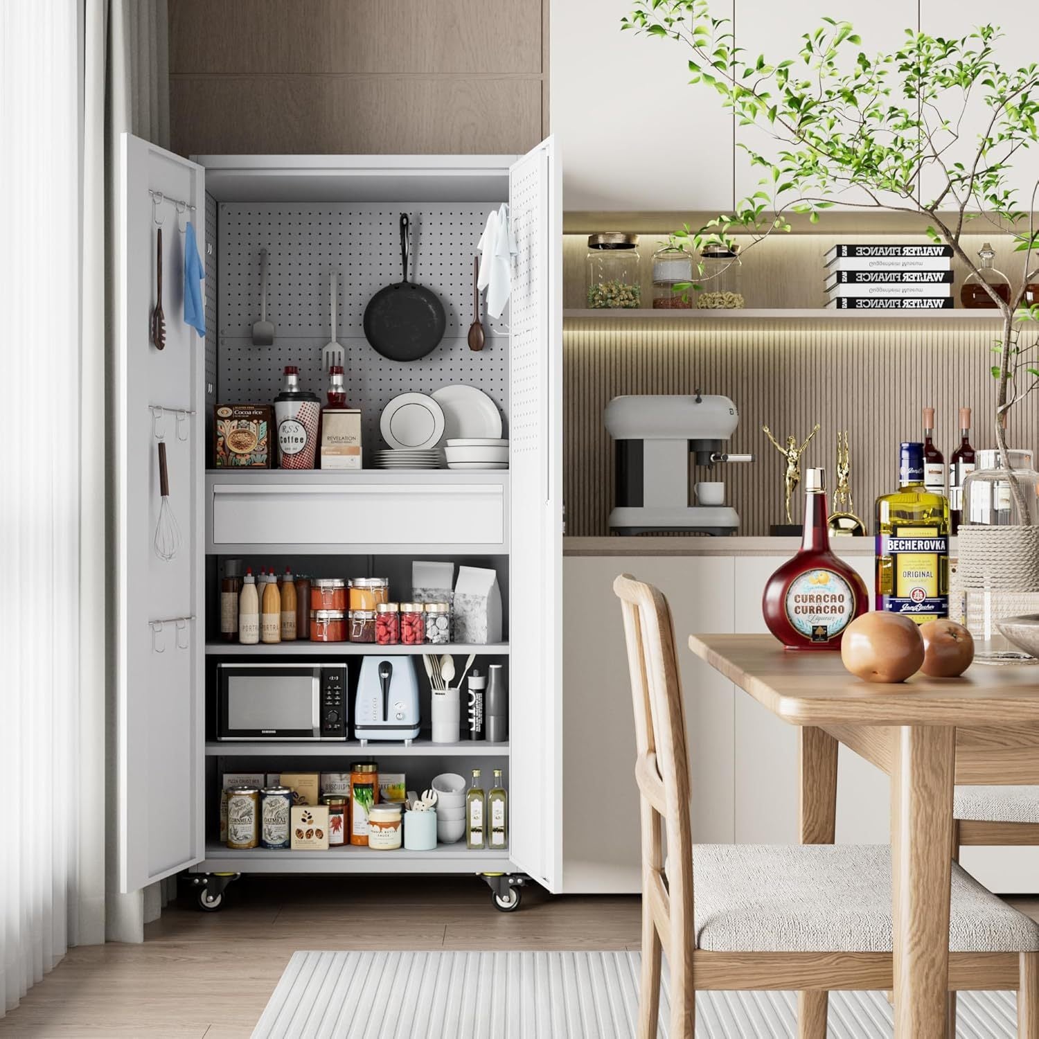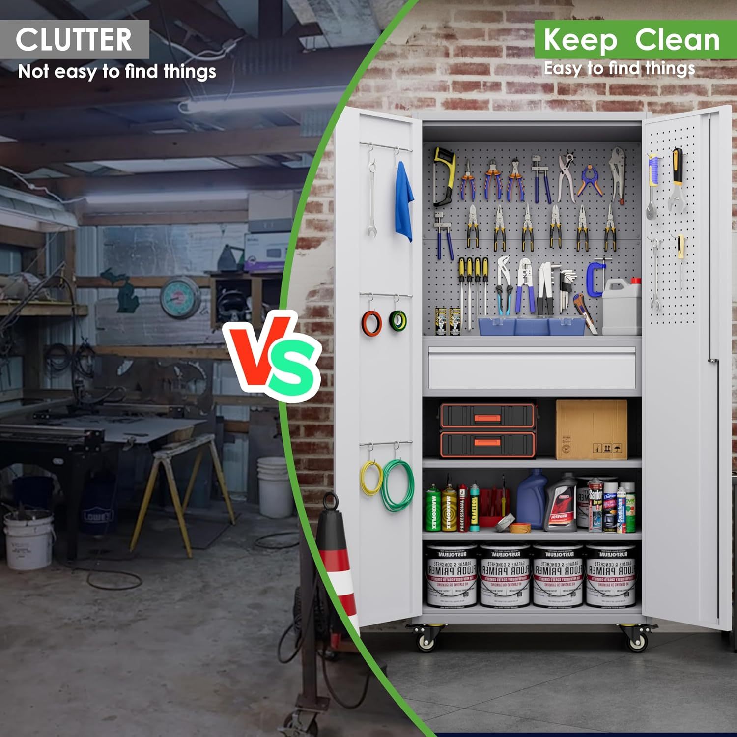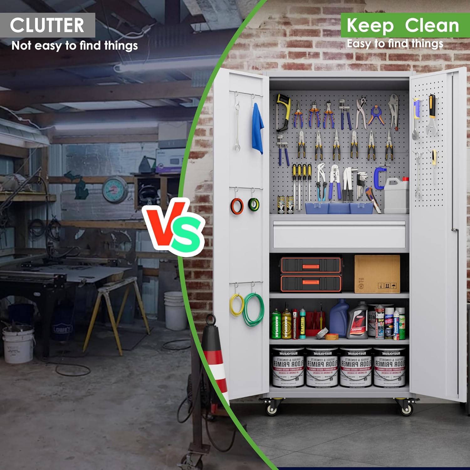 US Local Metal Garage Storage Cabinet With Wheels And Doors,Rolling Tool Cabinet With Pegboard,Rod And Drawer For Garage Warehouse Home,Required Assembly,Grey And White