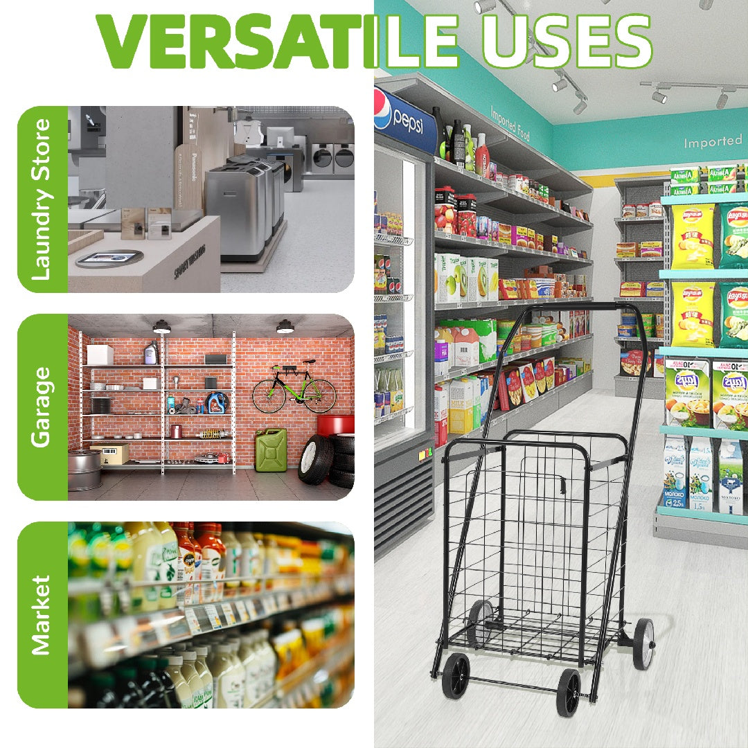 - VERSATILE: VERSATILE: This versatile grocery cart can carry most items from laundry and groceries to camping gear and gardening tools. The large basket capacity makes it ideal for shopping, transporting luggage or storage, making it ideal for everyday household use.