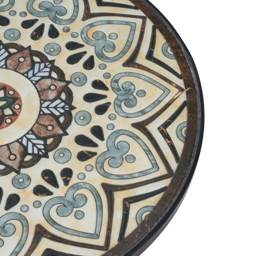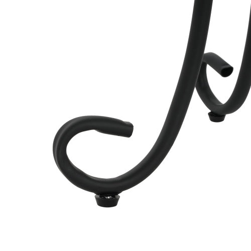 - This vibrant side table updates any room's aesthetic, whether it's in a corner of your den or out on your back patio. The ceramic surface showcases a charming floral design in distressed hues of your choice. Its curved, powder-coated black steel frame features scrolling legs with a circular, slatted lower shelf to give you a second platform for potted plants or other d¨¦cor. This end table's 14" diameter means it fits in space-conscious areas anywhere in your home.