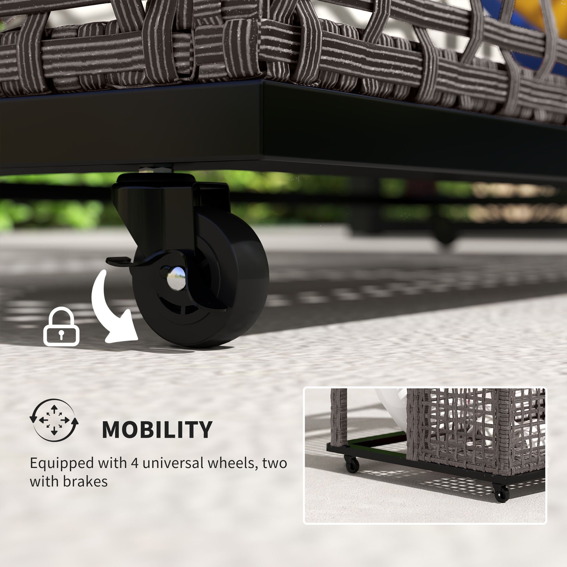- - Made with a powder-coated steel frame and handwoven PE wicker for outdoor use