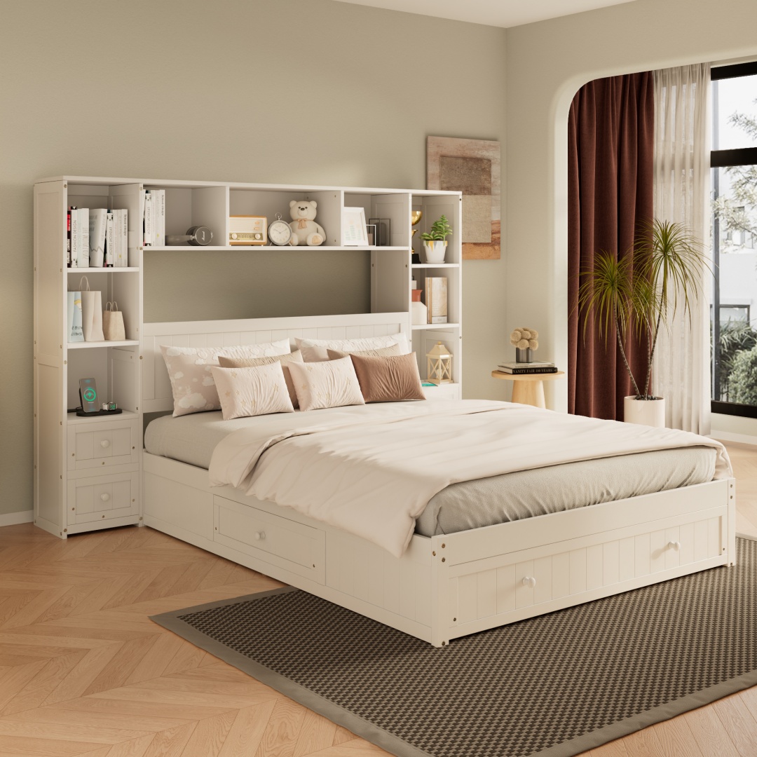 Product Name:Queen Size Pine Wood Platform Bed with All-In-One 2 Nightstand, Storage Shelf and Cabinet Bookcase with 2 Charging Stations, Multi-Functional Captain Bed Frame with 3 Drawers, No Box Spring Needed