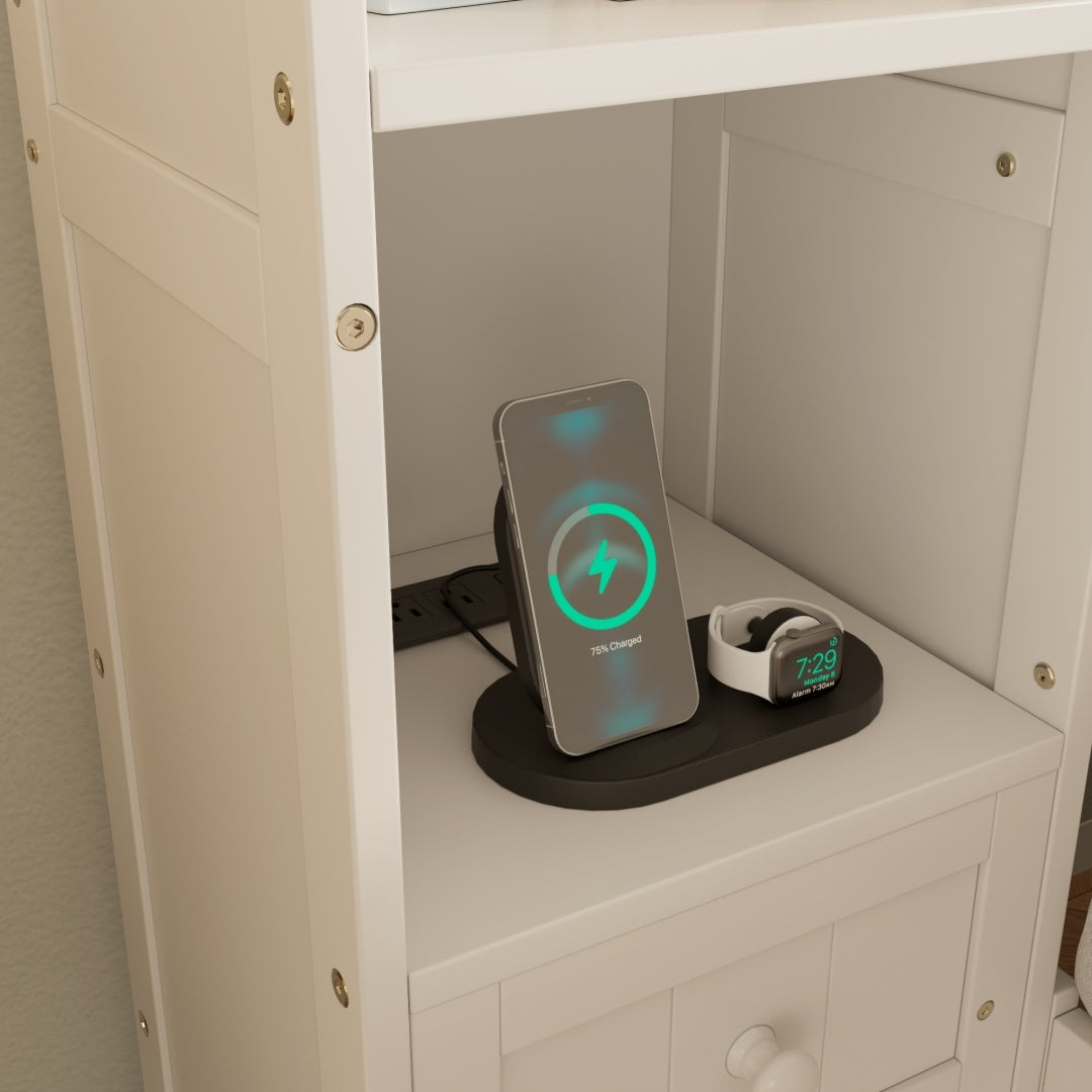 US Local Queen Size Pine Wood Platform Bed With All-In-One 2 Nightstand, Storage Shelf And Cabinet Bookcase With 2 Charging Stations, Multi-Functional Captain Bed Frame With 3 Drawers, No Box Spring Needed