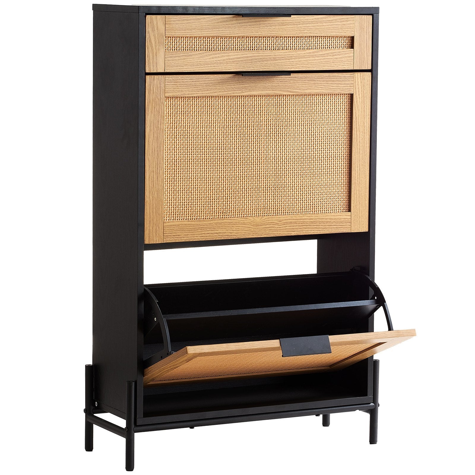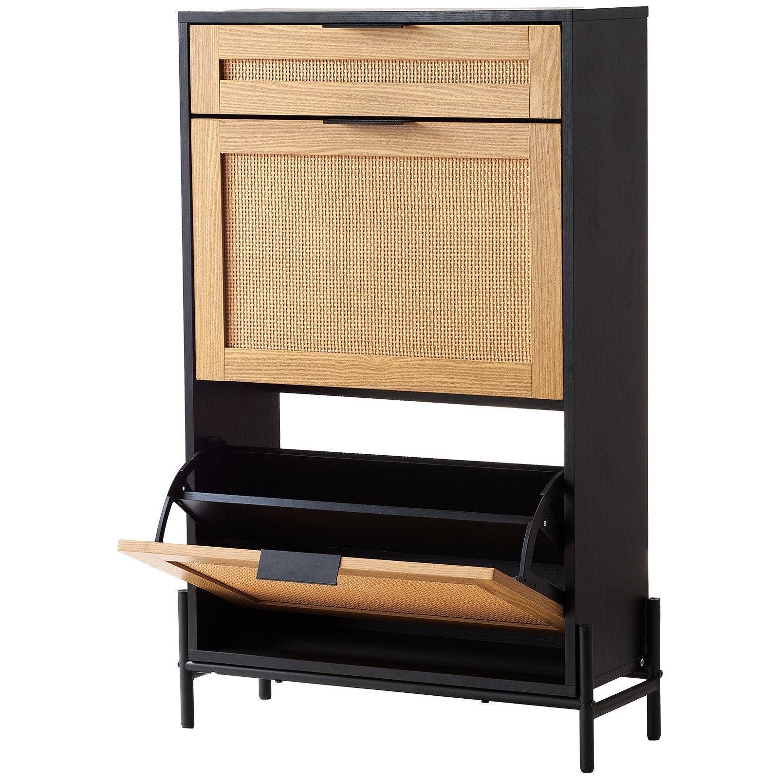 US Local Rattan Shoe Cabinet, Narrow Shoe Storage Organizer With 2 Flip Rattan Drawers & 1 Slide Drawer, Metal Legs, Slim Shoe Entryway Cabinet Ideal For Entryway, Closet, Hallway, Black