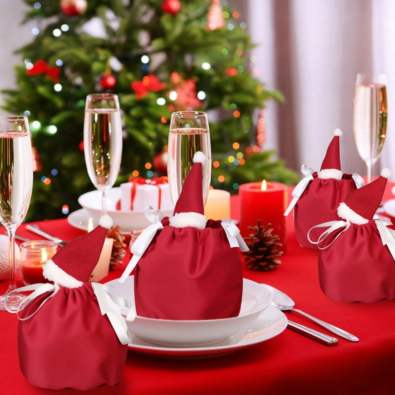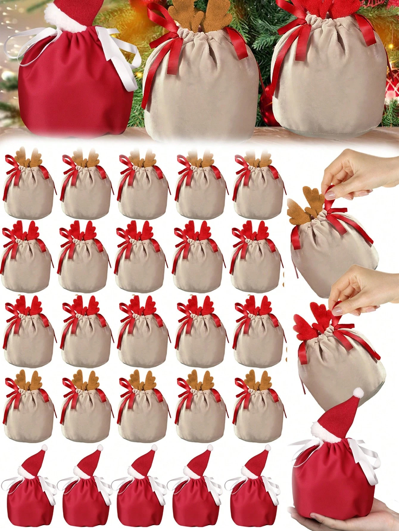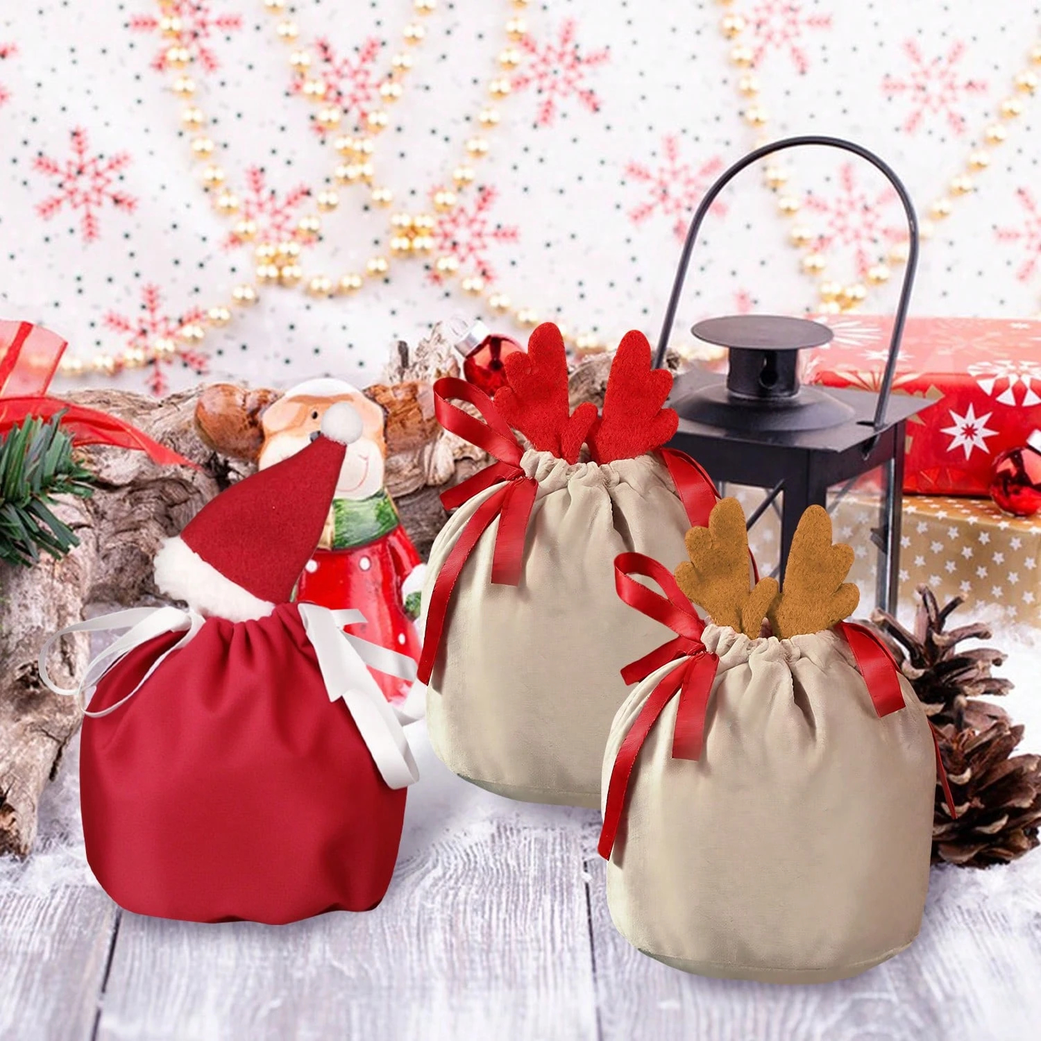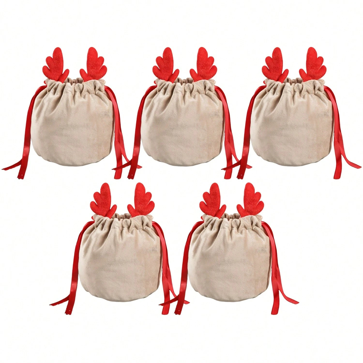 US Local Set Of 5 Christmas Velvet Drawstring Gift Bags With Reindeer Antler Design. Suitable For Organizing Jewelry Or Candy. Santa Gift Bags, Perfect For Holidays, Weddings, And Birthday Party Favors.