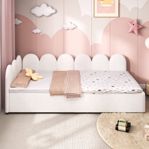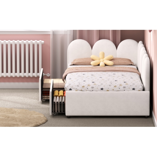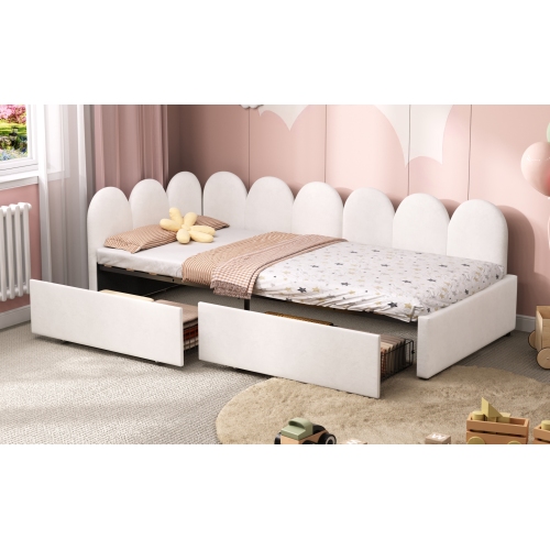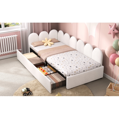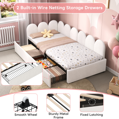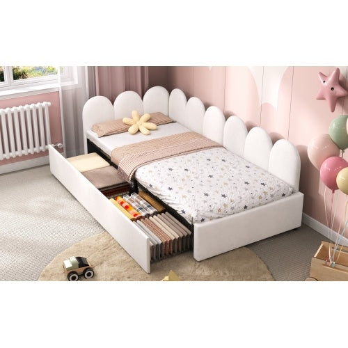 UK Local 3ft Single Daybed With Two Storage Drawers, Modern Youth Bed Frame With Wooden Slats, Velvet Sofa Bed For Living Room Bedroom Study Room, 90X190cm, Easy Assembly, Cream White