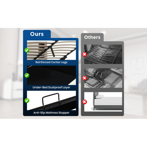 - ??Gas Pressure Spring Bed Design??Experience ample storage with this innovative bed design. Beneath the folding slatted frame lies a spacious bed base, offering plenty of room to store blankets, pillows, or sheets. The slatted frame can be effortlessly lifted using the gas pressure spring mechanism. To keep dust out, an Oxford cloth is attached to the underside of the bed. Additionally, we include a convenient handle lift, making it easy to access the storage space whenever needed.