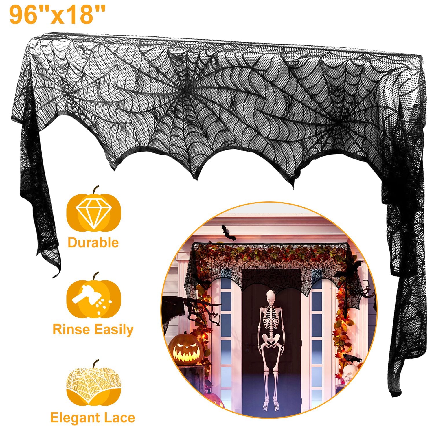 US Local 2PCS Halloween Mantle Scarf (96"x18") - Black Lace with Spider Web, Spider & Bat Design, Soft Anti-Crease Fabric - Perfect for Fireplace, Haunted House, Party Decor