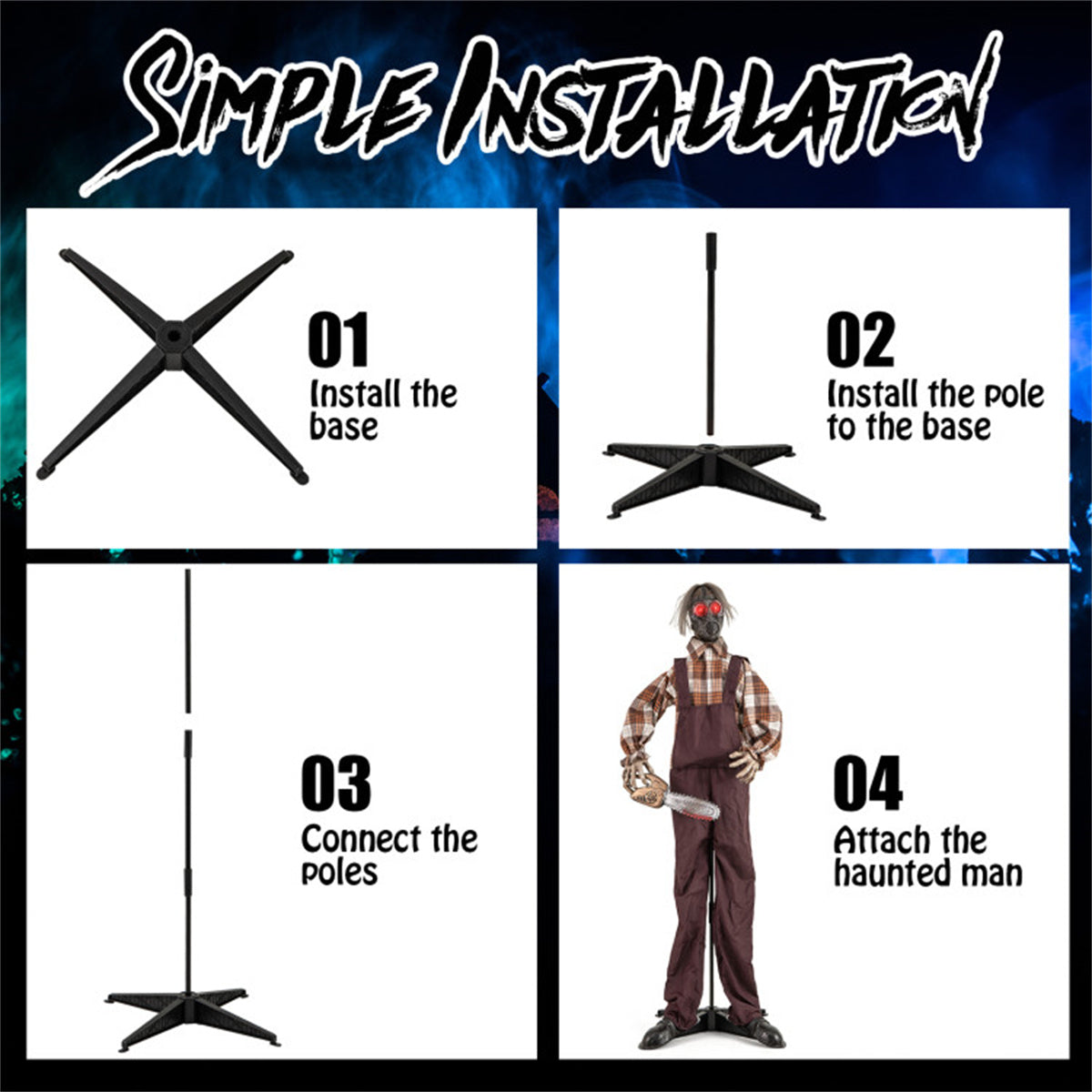 ● Simple Installation: Set up is a breeze with the included easy-to-follow instructions. You just need to install the base, install the pole to the base, connect and poles and attach the haunted man.