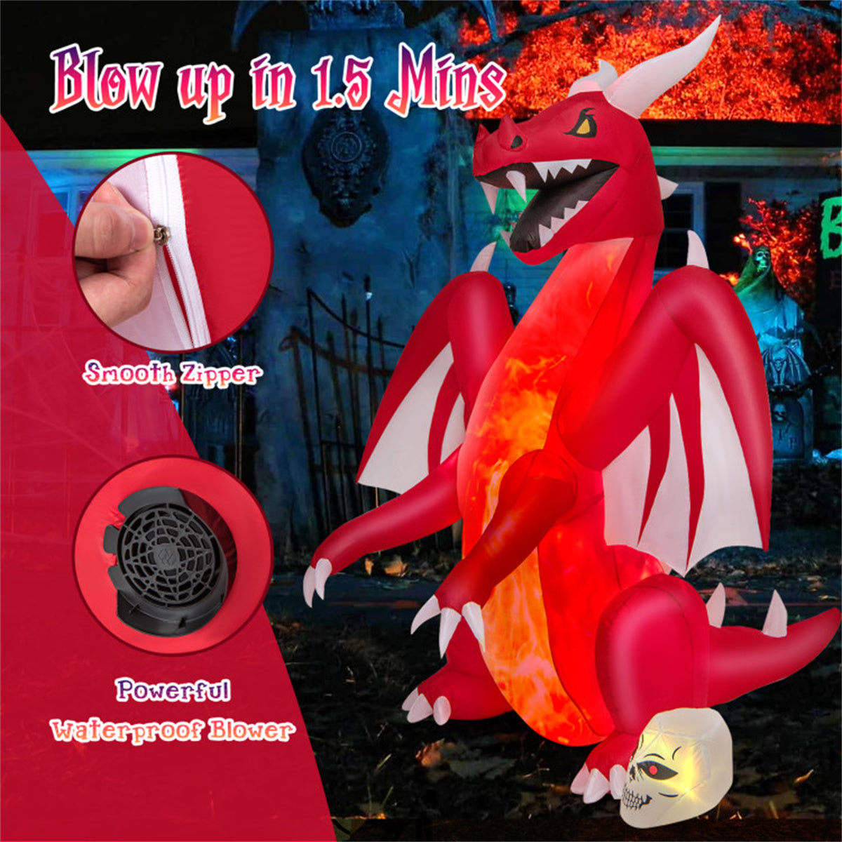 ● Eye-Catching Glow Effect: This blow-up dragon decoration is equipped with a built-in flame effect disco light that resembles a fire-breathing dragon, and a multi-color flashing light in the skull that creates a dazzling light show. Thus, it can create a mesmerizing and spooky ambiance during the Halloween season.