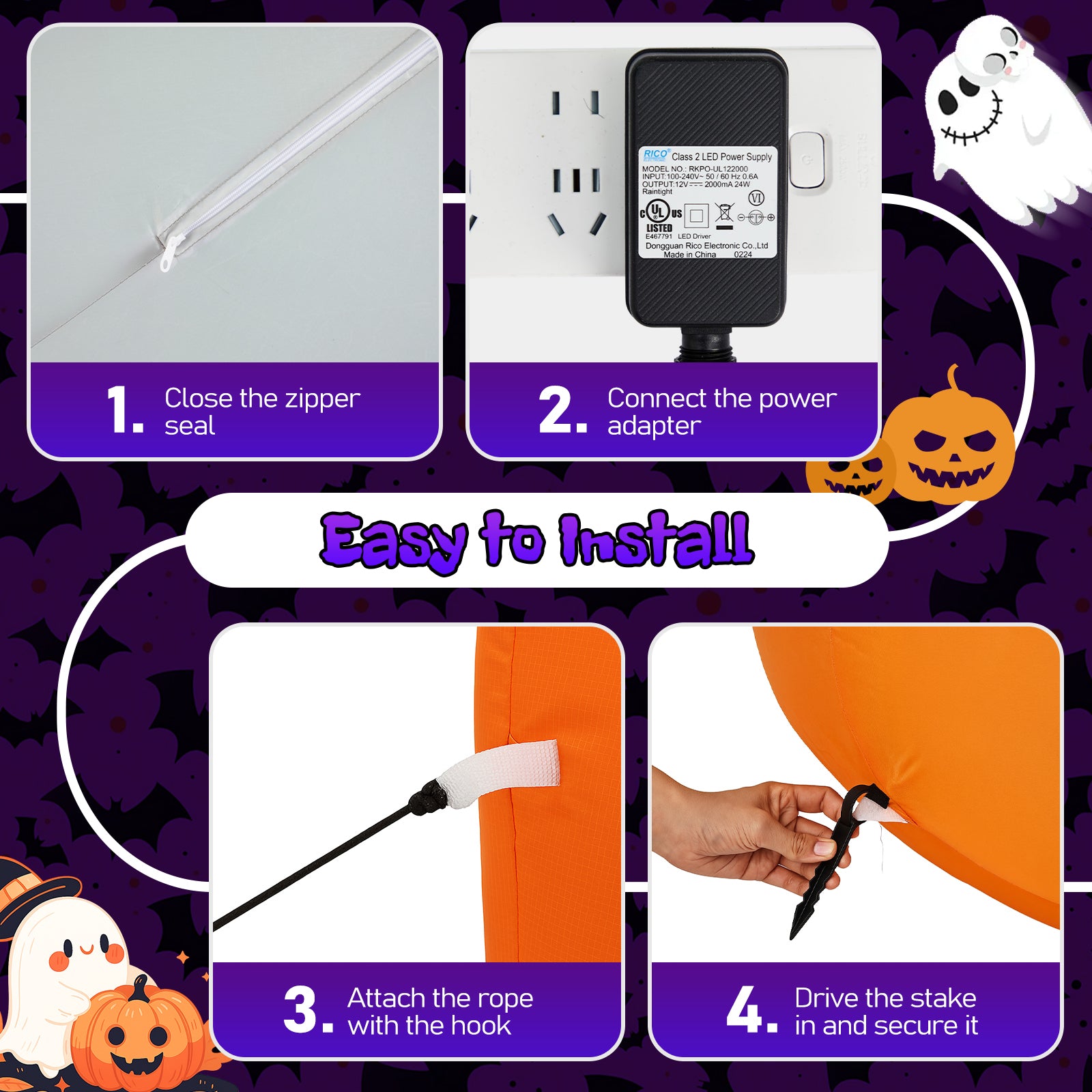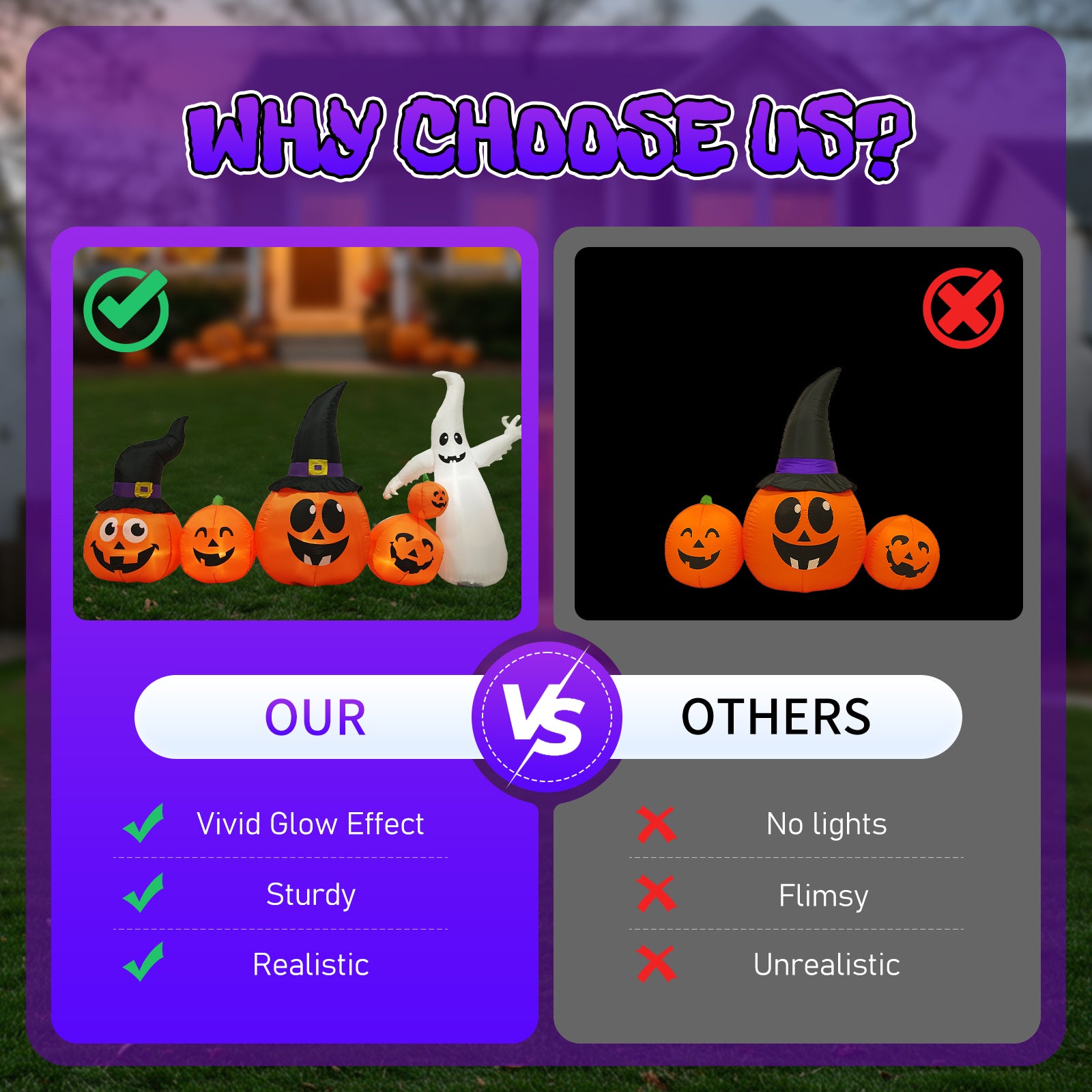 Add playful spookiness to your Halloween display with this 8FT long inflatable pumpkin ghost decoration! Featuring a festive mix of pumpkins and a ghost waving hands, this vibrant blow-up scene welcomes trick-or-treaters with fun and fright. Equipped with built-in warm white LED lights, it glows beautifully at night, making it a showstopper in your yard, garden, or even indoors. Made from high-quality waterproof polyester and designed for fast inflation and easy storage, this inflatable is a must-have for your Halloween festivities year after year.