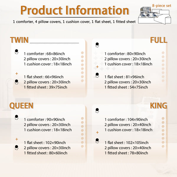 Package Includes: 1 Comforter +1 Pilow Cover+1 Flat Sheet+1 Fitted Sheet+4 Cushion Cover