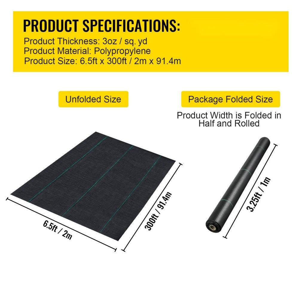 US Local VEVOR 6.5FTx300FT Premium Weed Barrier Fabric Heavy Duty 3OZ, Woven Weed Control Fabric, High Permeability Good For Flower Bed, Geotextile Fabric For Underlayment, Polyethylene Ground Cover