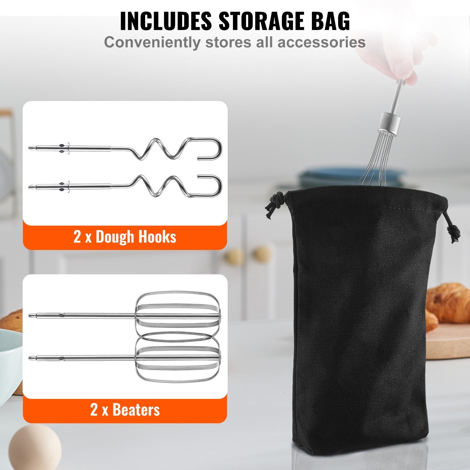 US Local VEVOR Cordless Electric Hand Mixer, 250W, Continuously Variable Electric Handheld Mixer, With Turbo Boost Beaters Dough Hooks Storage Bag, Baking Supplies For Whipping Mixing Egg Cookie Cake Cream