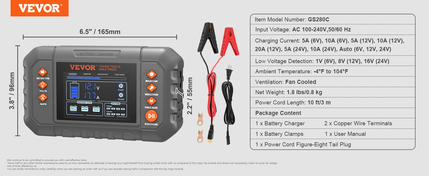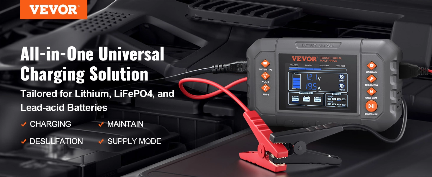 US Local VEVOR Smart Battery Charger, 20-Amp, Lithium LiFePO4 Lead-Acid AGM Gel SLA Car Battery Charger With LCD Display, Trickle Charger Maintainer Desulfator For Boat Motorcycle Lawn Mower Deep Cycle