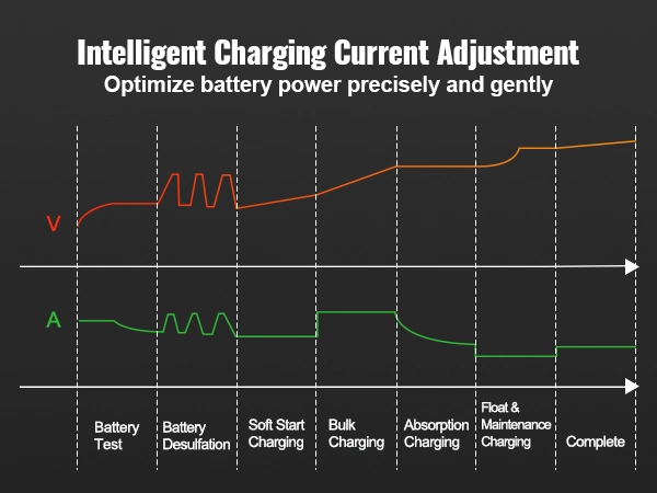 - Four Modes, One Charger: Choose your mode to maximize lithium battery charger performance! 1. Charging Mode: Automatically detects 6/12/24V batteries, or you can manually select. With 7-level intelligent charging, this car battery charger automatically switches to trickle charging once the battery is full. 2. Maintain Mode: Sustains charging with a lower current. 3. Desulfation Mode: Employs pulse repair functionality. 4. Force Mode: Charges batteries with voltages as low as 1V.