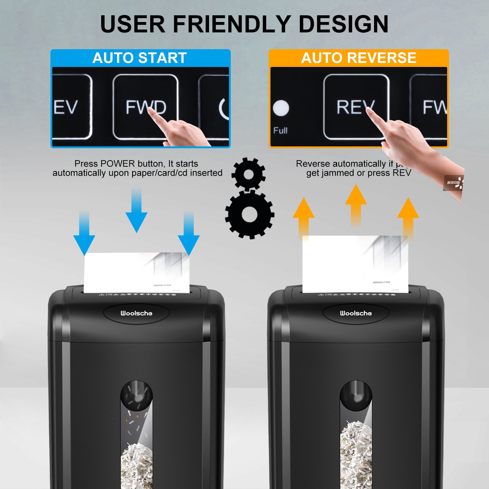 ??Convinient Design &15 Minutes Shredding??With 15 minutes Non-Stop Shedding,overload operation of the Home shredder machine will Auto start overheating protection with 45 munites cooling time. It include 3-mode control switches (FWD,Power and Auto reverse functions simplify shredding and paper jammed clearing processes